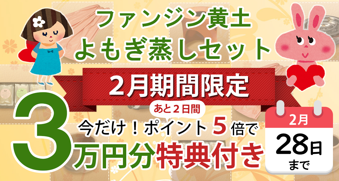 韓国の五色黄土を使用した、ファンジンのよもぎ蒸し座浴器セットをご購入頂いた方には、2月期間限定で全員に『3万円の高級座浴剤(選べる特典6種類!)』を無料でプレゼントいたします。