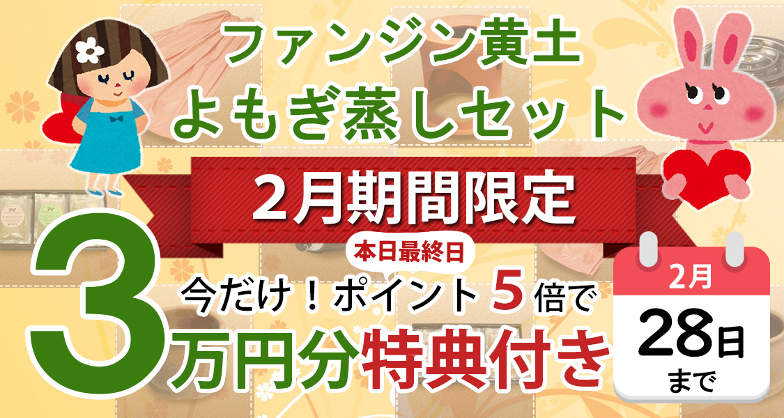 韓国の五色黄土を使用した、ファンジンのよもぎ蒸し座浴器セットをご購入頂いた方には、2月期間限定で全員に『3万円の高級座浴剤(選べる特典6種類!)』を無料でプレゼントいたします。